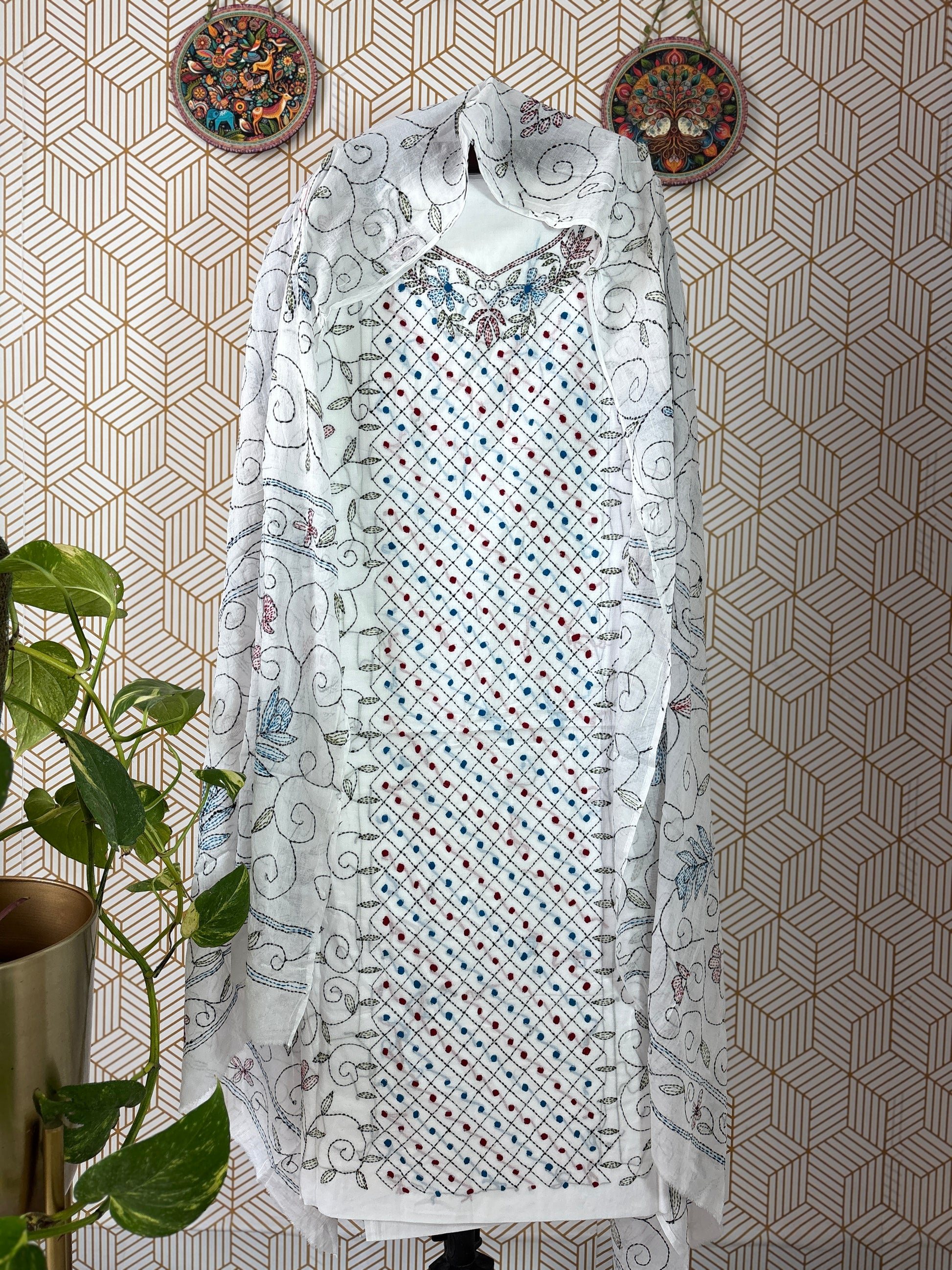 Bengal Handloom- Kanth Stich Geometrical Shape Pure Cotton Embroided Suit Set