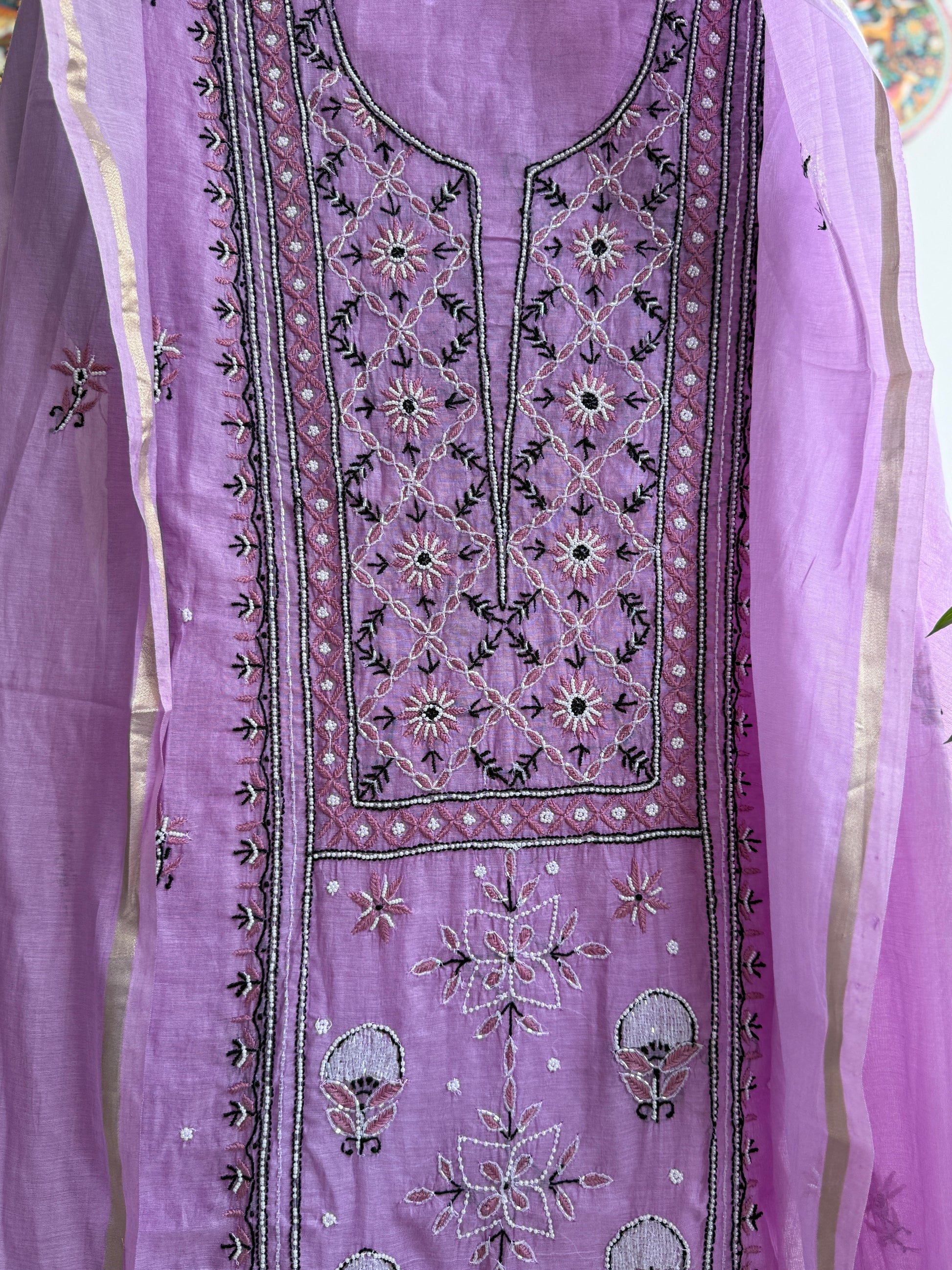 Lucknowi Chikankari Thread Work and full panel work in Mul Chanderi add on Pearl Work and Cut Dana (Colorfull Embroidery)