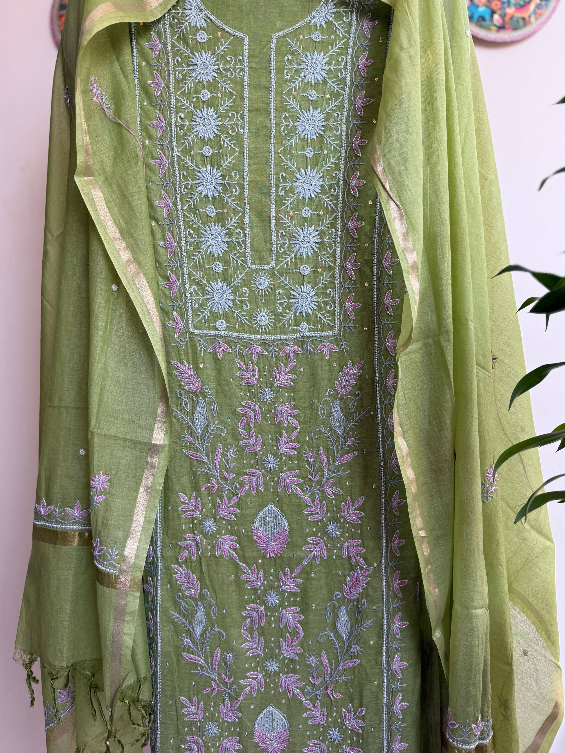 This ladies dress material set is woven in the softest Mulchanderi - featherlight, naturally graceful and handwork with fine pearl handwork using cut Dana ka kaam ✨