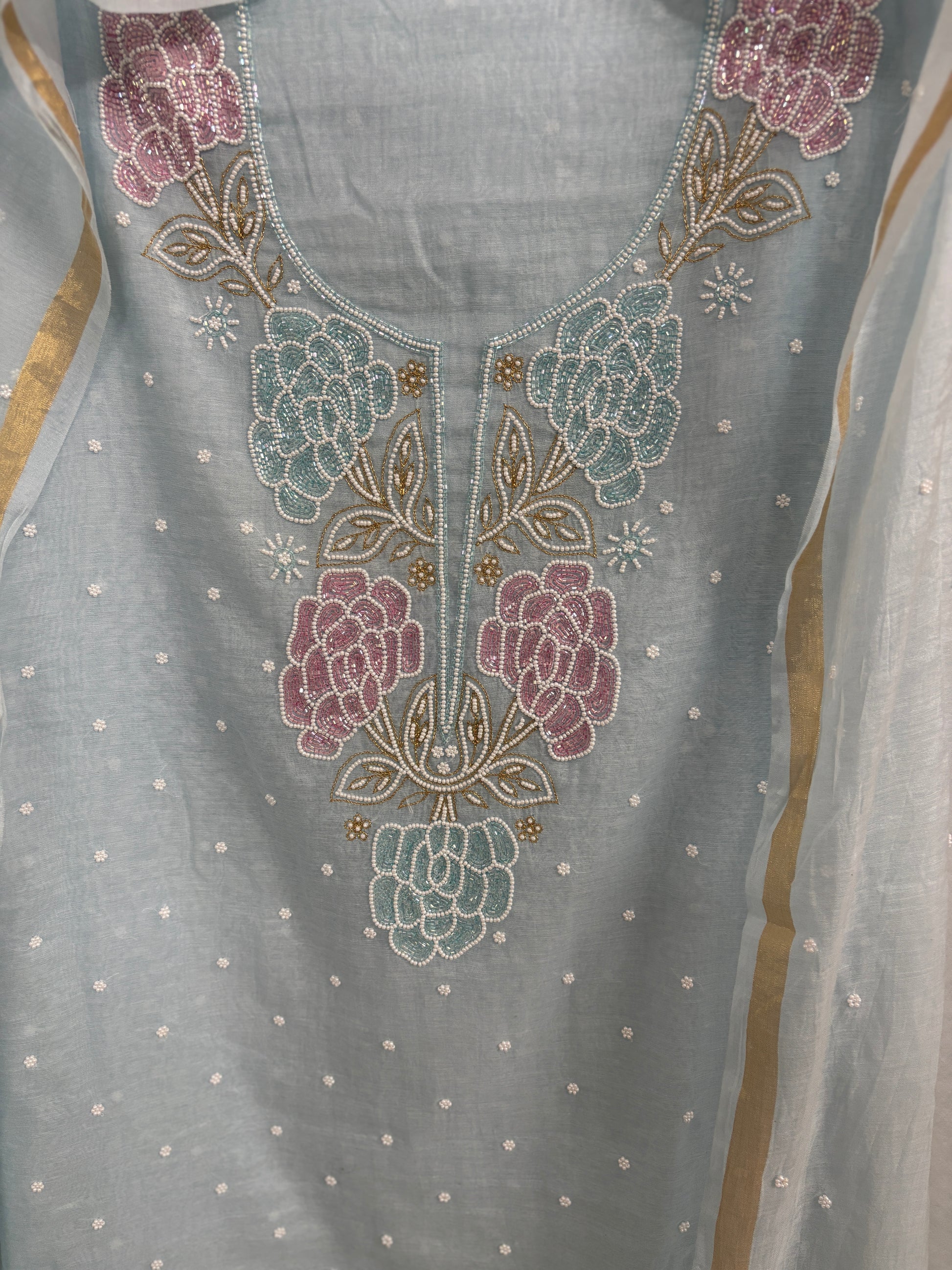 This ladies dress material set is woven in the softest mul chanderi - featherlight, naturally graceful and handwork with fine pearl handwork using cut Dana ka kaam ✨
