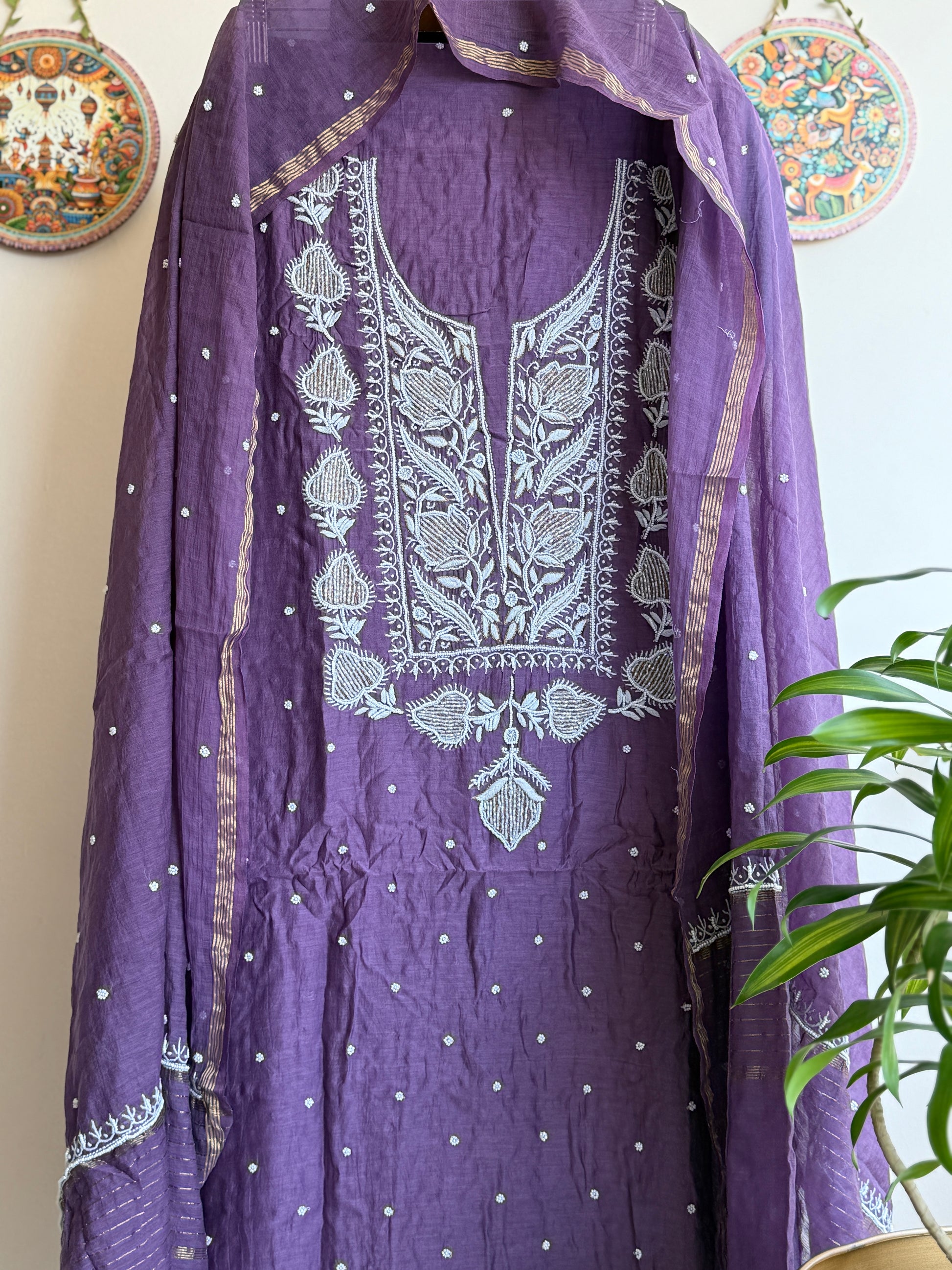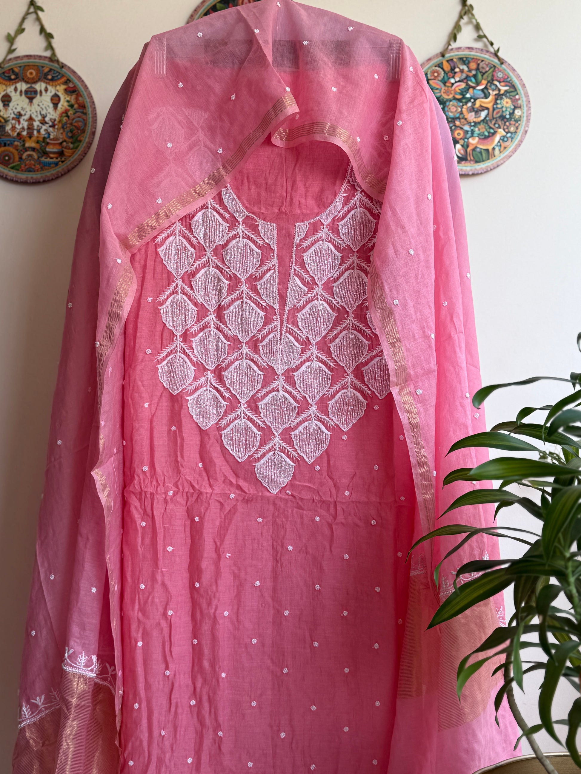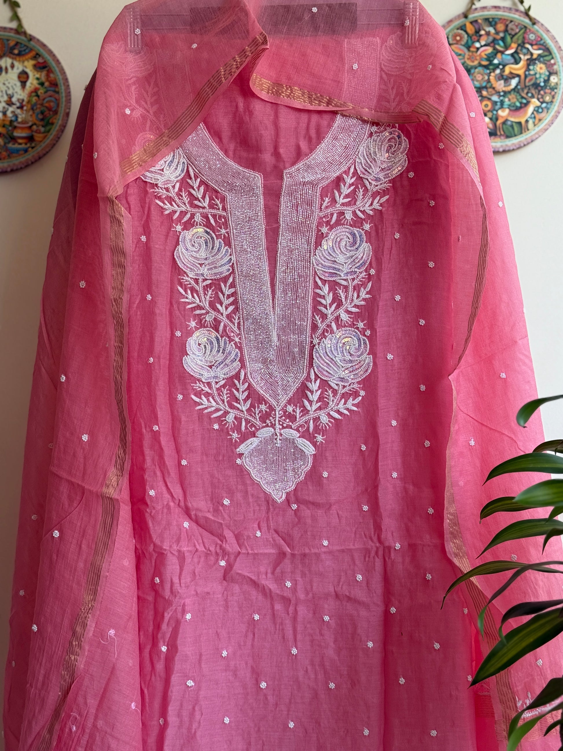 This ladies dress material set is woven in the softest Mulchanderi - featherlight, naturally graceful and handwork with fine pearl handwork using cut Dana ka kaam ✨