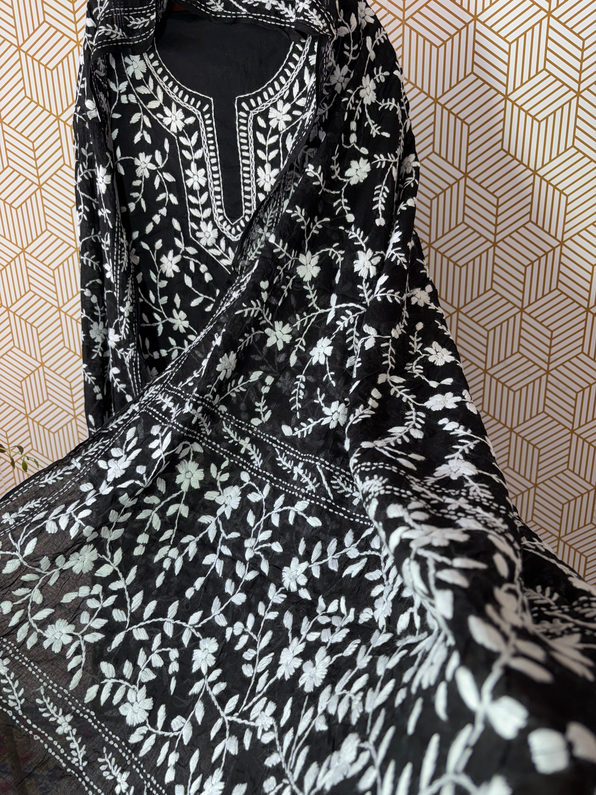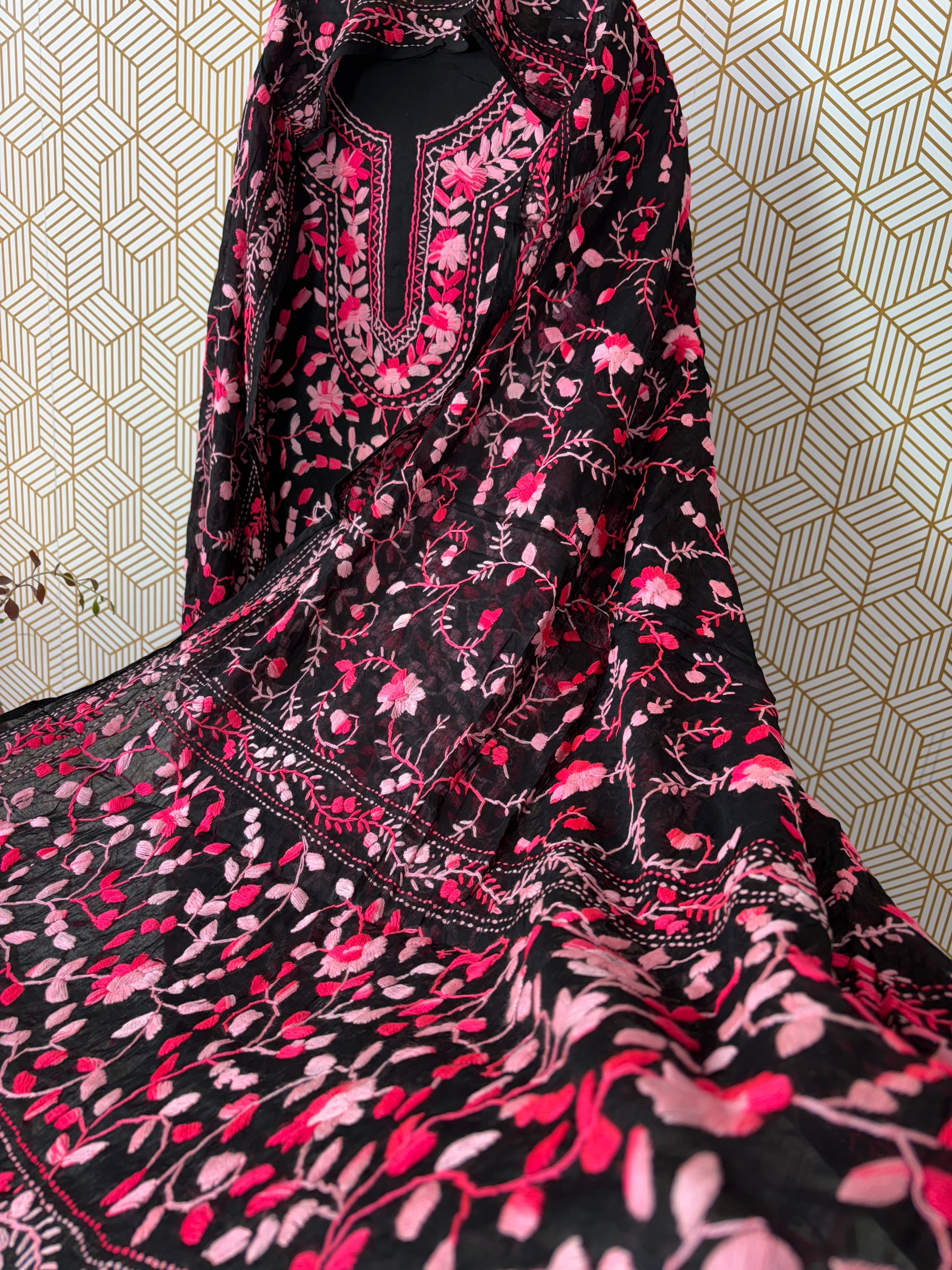 Phoolkari hand embroidered top ,bottom and duppata set in pure cotton