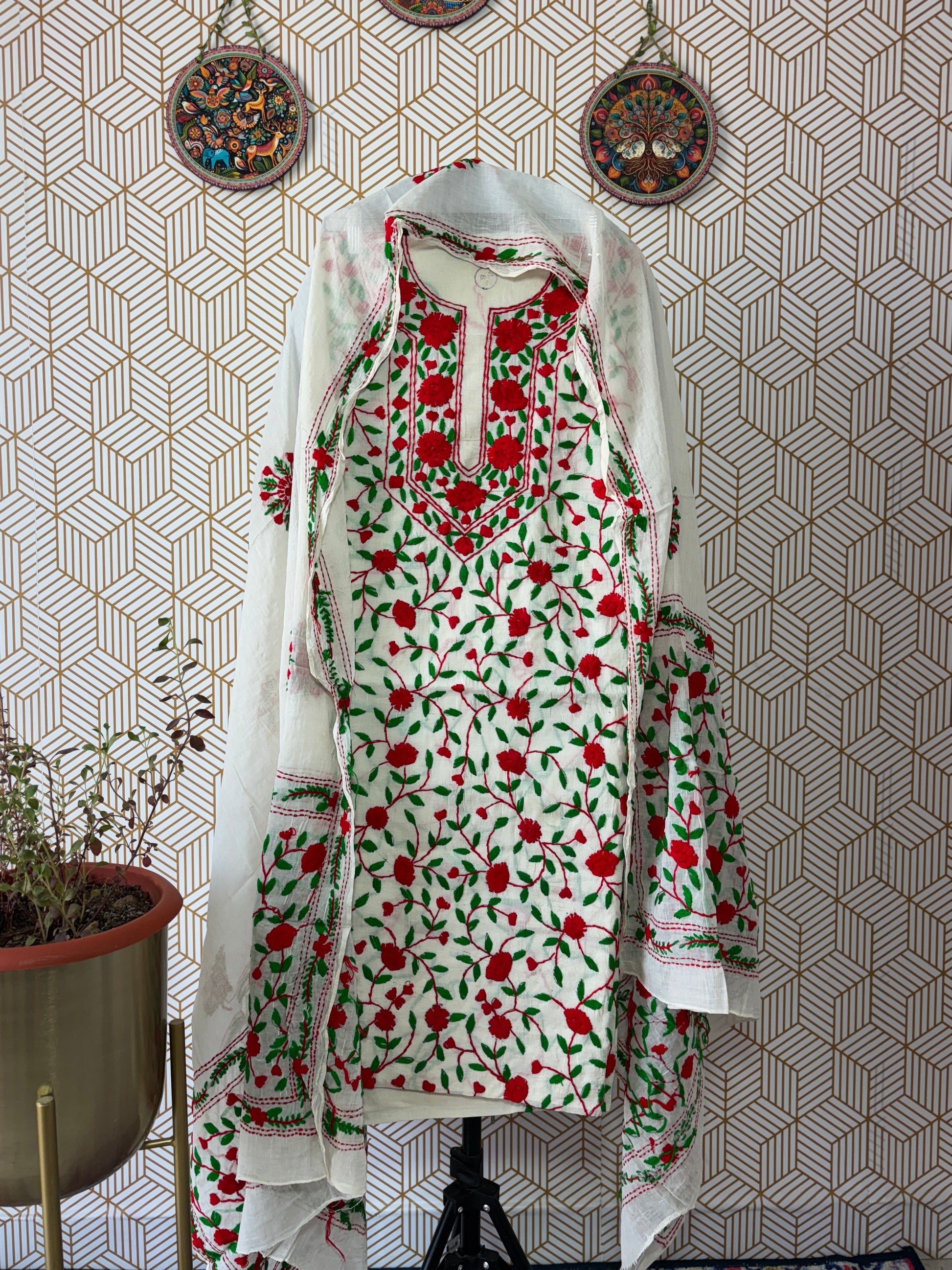 Phoolkari hand embroidered Suit Set- White Base with Multi Color Flower